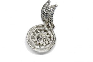 Collier piceno in argento con quarzo: tre elementi in argento, cuoio e quarzo per un gioiello disponibile, ispirato alla tradizione e all’eleganza.