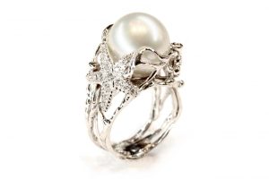 Anello in oro bianco con perla australiana e diamanti, eleganza classica della Selezione Storica.
